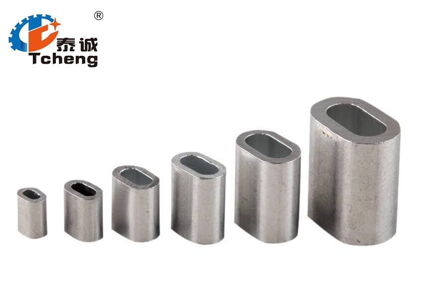 鋼絲繩鋁套—鋁套是鋁材質(zhì)的,較輕,用來固定鋼絲繩兩端的頭的,鋼絲繩根據(jù)需要的掛圈大小,插入鋁套,然后放入壓套機模具內(nèi),(根據(jù)鋁套型號對應(yīng)壓套機模具,模具型號跟鋁套型號都是標準尺寸),壓制完,把兩邊擠壓出來的鋁廢料清理掉,一根鋼絲繩完成!